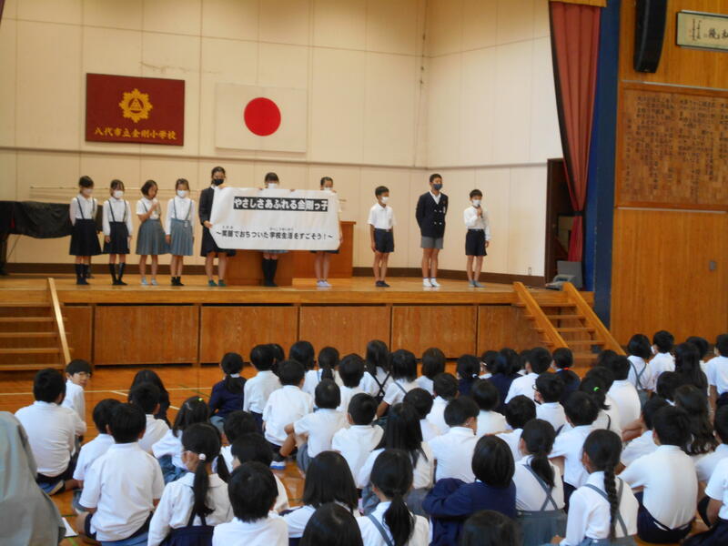 遠足に続き、5月16日、児童集会を3年ぶりに行いました。運営委員から今年度のスローガンが発表されました。「やさしさあふれる金剛っ子~笑顔でおちついた学校生活をすごそう!~」とても金剛小に似合うテーマです。みんなで達成していきましょう!