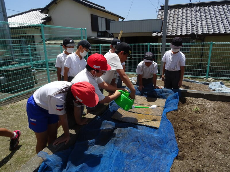 5月24日(水)に地域の塚田さんから土づくりについて教えていただきました。写真はその時のようすです。本年度はバケツ稲の取組を行います。5月26日(金)には、学校の近くの田んぼに出かけ、田起こしについて学習しました。地域の方と交流を深めながら学習を進めていきます。