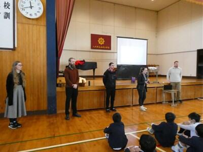 2月16日に八代市のALTの先生方と1時間を過ごしながらコミュニケーション力を高める授業を行いました。先週、5・6年生のようすをご紹介したところです。4年生は、ゲームはせず、ALTの先生の自己紹介をしっかりと聴く時間となりました。「何を言われているのかな?」と集中している姿が印象的でした。