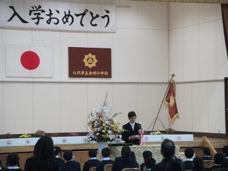9名の先生方をお迎えし、代表児童が歓迎のあいさつ。