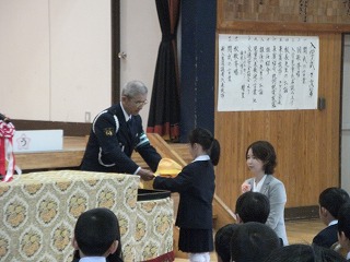 最後に、交通安全協会よりランドセルカバー・黄色い帽子の贈呈がありました。
