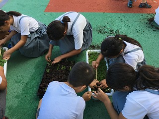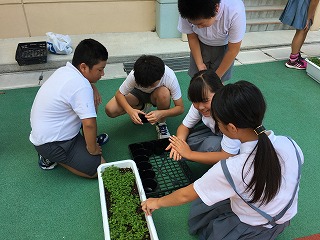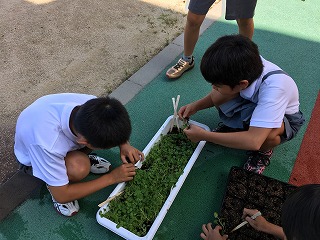 今日は、5年生の学習会があり、先日台風でできなかったサクラソウのポット上げをしました。本日もゲストティーチャーとして前太田郷小学校長の山田健二先生にお越し頂き、ご指導頂きました。暑い中ではありましたが、子どもたちは一生懸命がんばり、1かご28ポットを16かご作ることができました。その時の様子です。