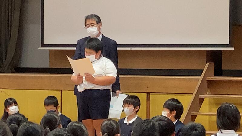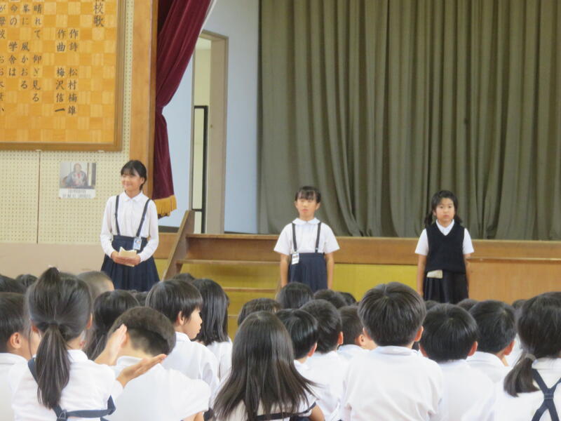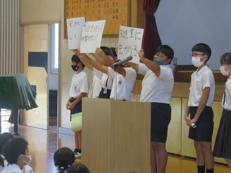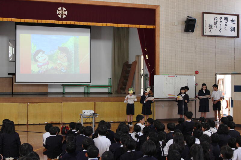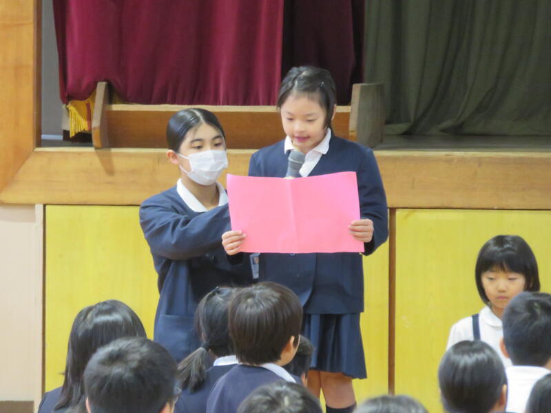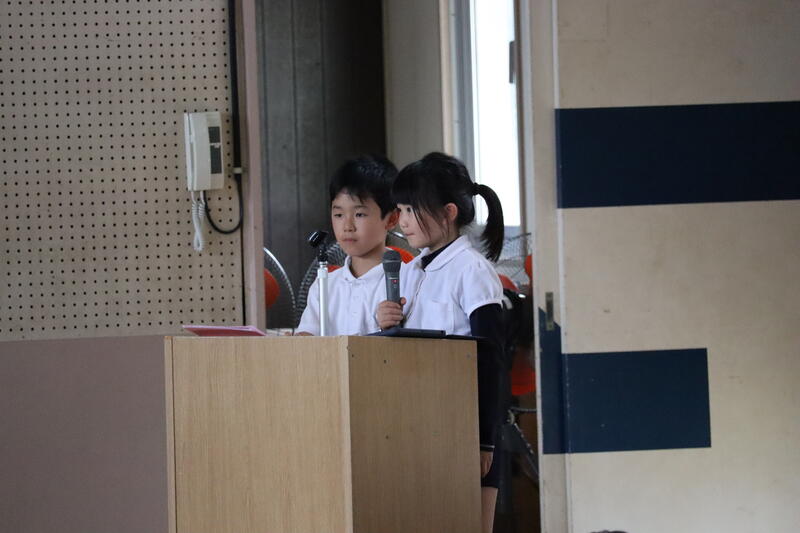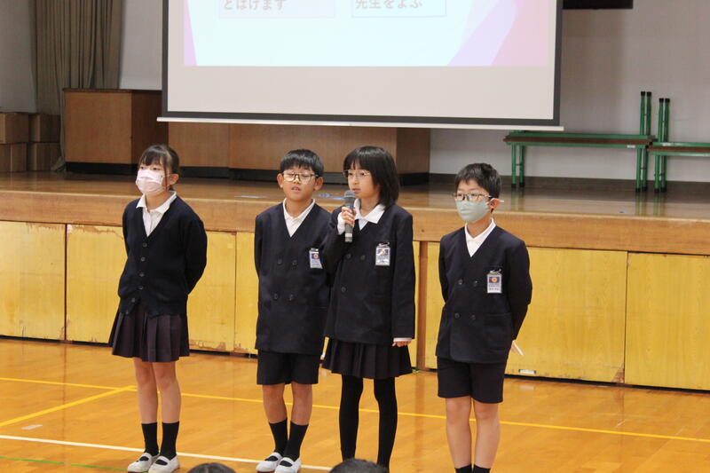 児童集会の運営は計画委員会が務めます。今回は4年生の計画委員会が司会進行、始めの言葉、終わりの言葉の担当をしました。
