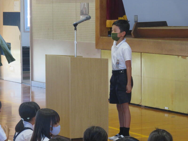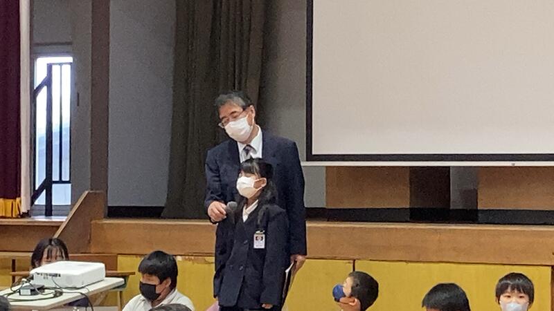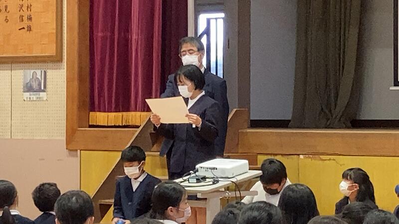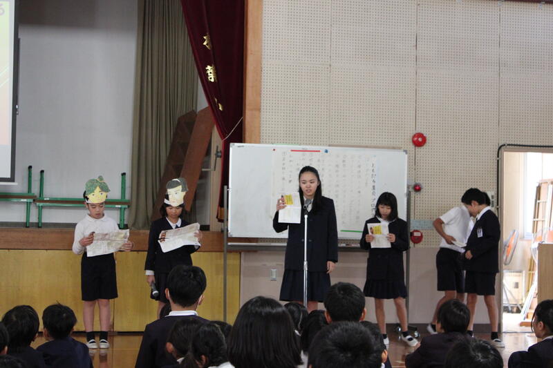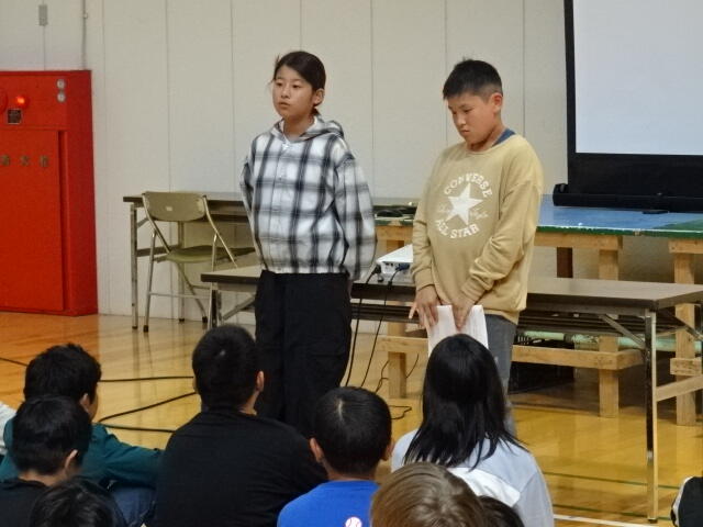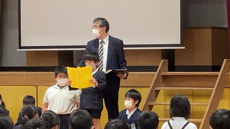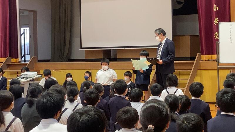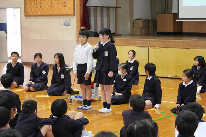 児童集会の運営は計画委員会が務めます。今回は4年生の計画委員会が司会進行、始めの言葉、終わりの言葉の担当をしました。