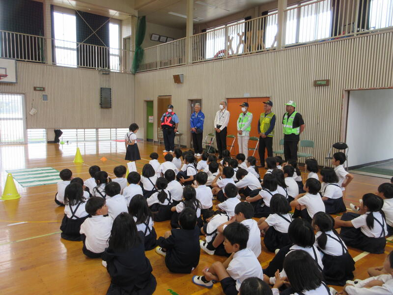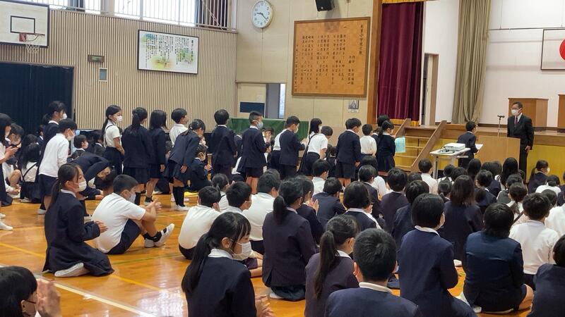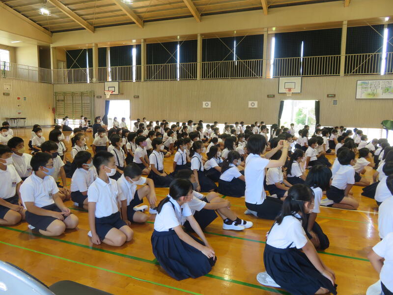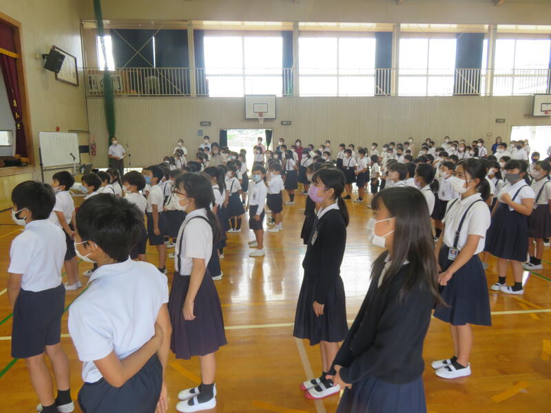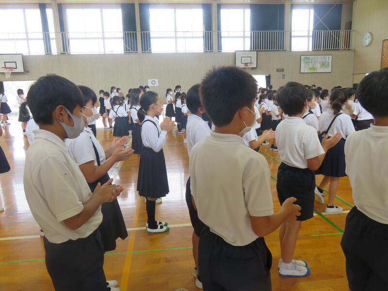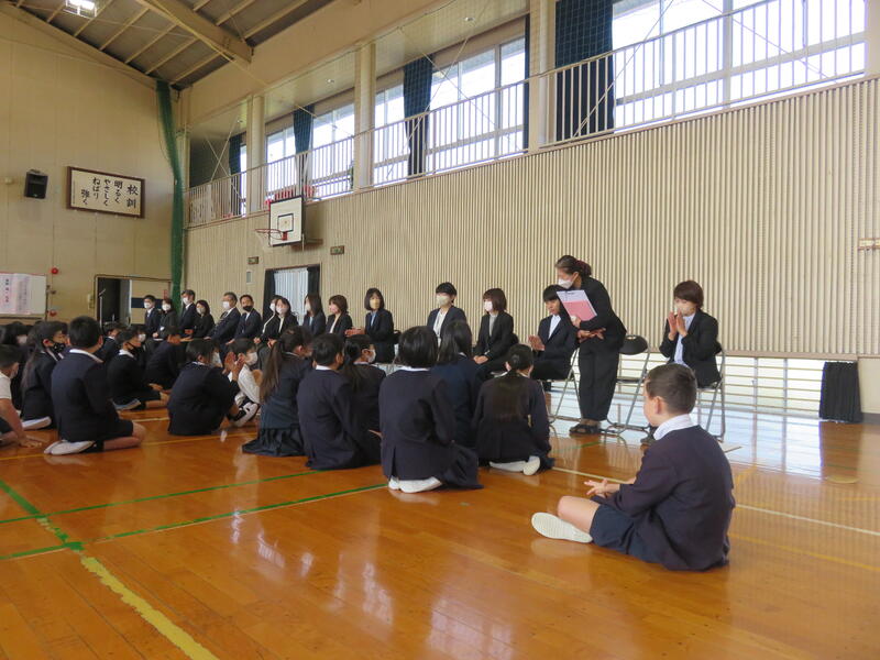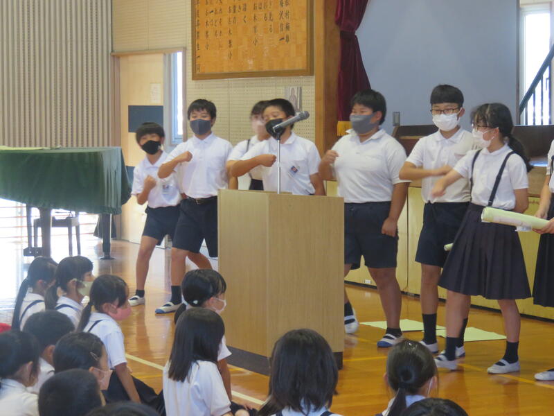 9月15日の業間、児童集会と実習生お見知り式を行いました。