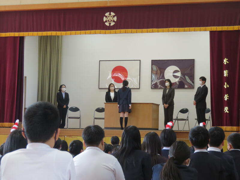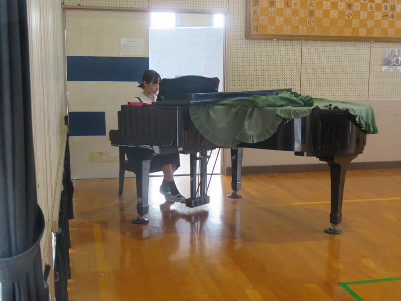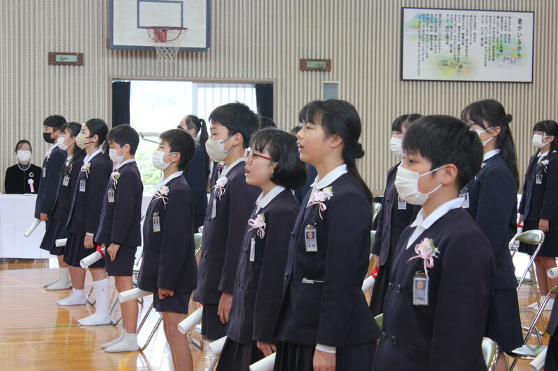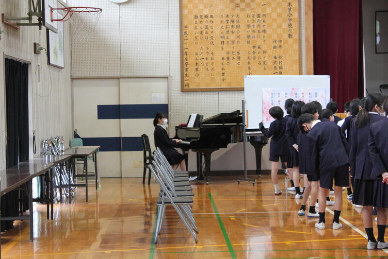 最後に校歌斉唱です。コロナの感染予防のため、大きな声で歌うことはまだ難しいですが、みんなで一緒に歌えることは嬉しいです。伴奏は6年生がしました。