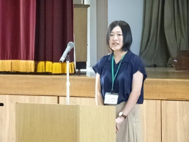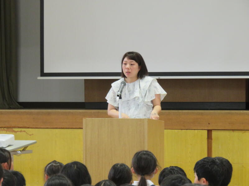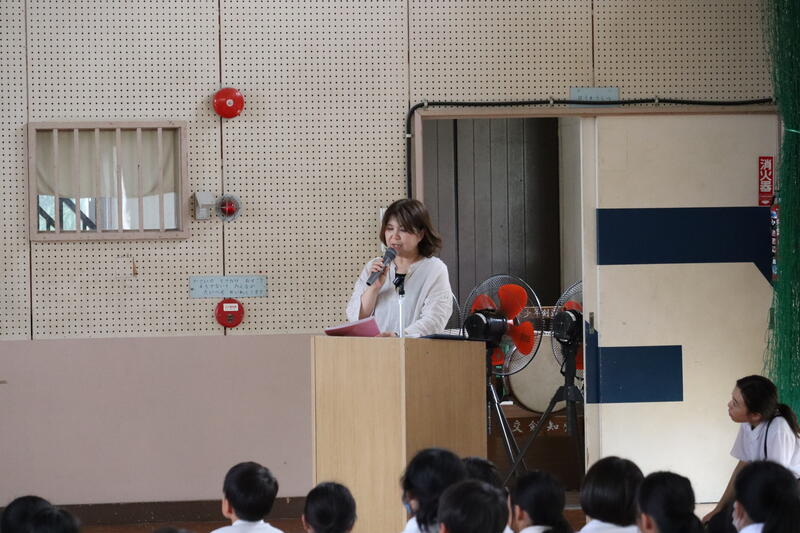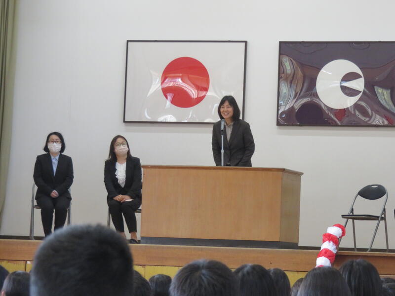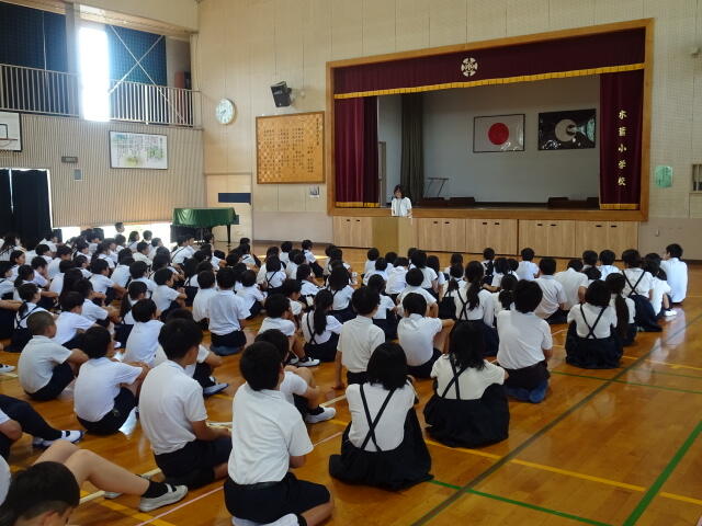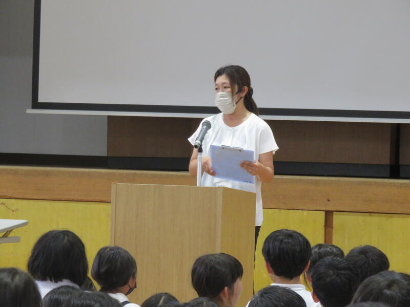 一時間目に「夏休み明け集会」が行われ、育児休業を終えた小松先生が挨拶されました。