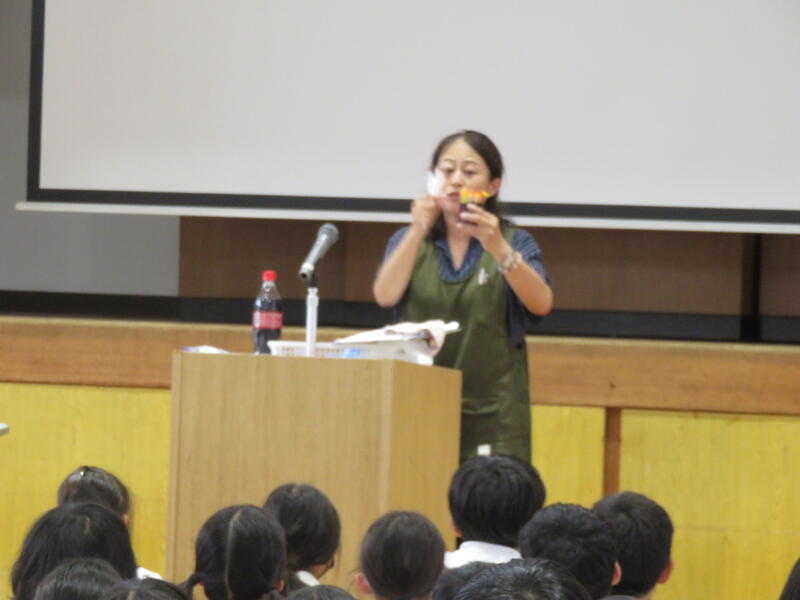 異国の文化を知ることは、日本について考えることに繋がります。民族衣装や食べ物、言語であるシンハラ語など教えていただき、親近感が高まりました。家庭科室で、ココナッツベースのサラダを一緒に調理して、食べました。とっても美味しかったです。