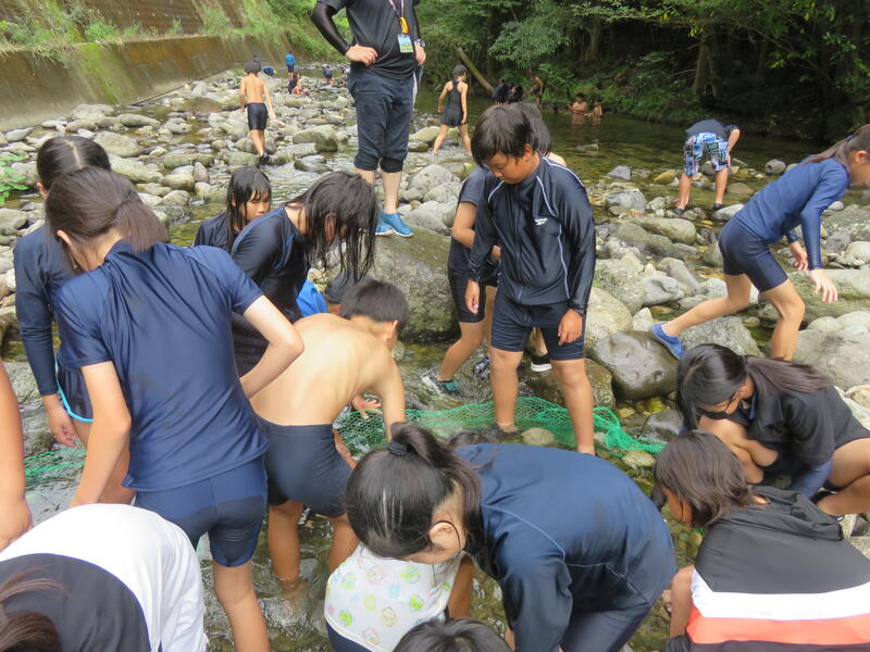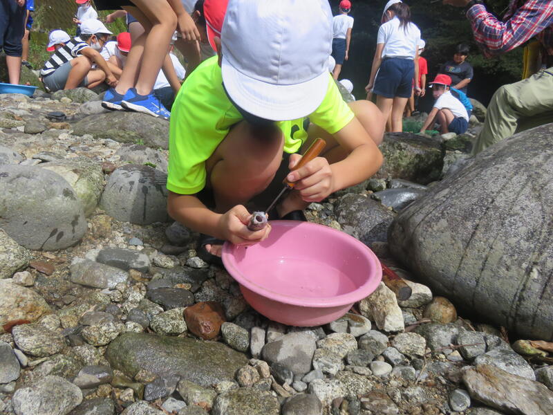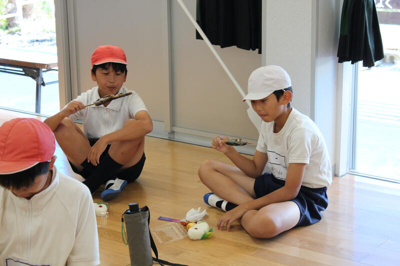 生きているニジマスを木の棒で頭を叩いて気絶させ、ナイフで内蔵を取りました。「かわいそう」と言う子もいましたが、生きている命をいただいていることに改めて気付くことができました。ニジマスの塩焼きと一緒におにぎり弁当を食べました。もちろん、ニジマスの塩焼きの味は最高です!!