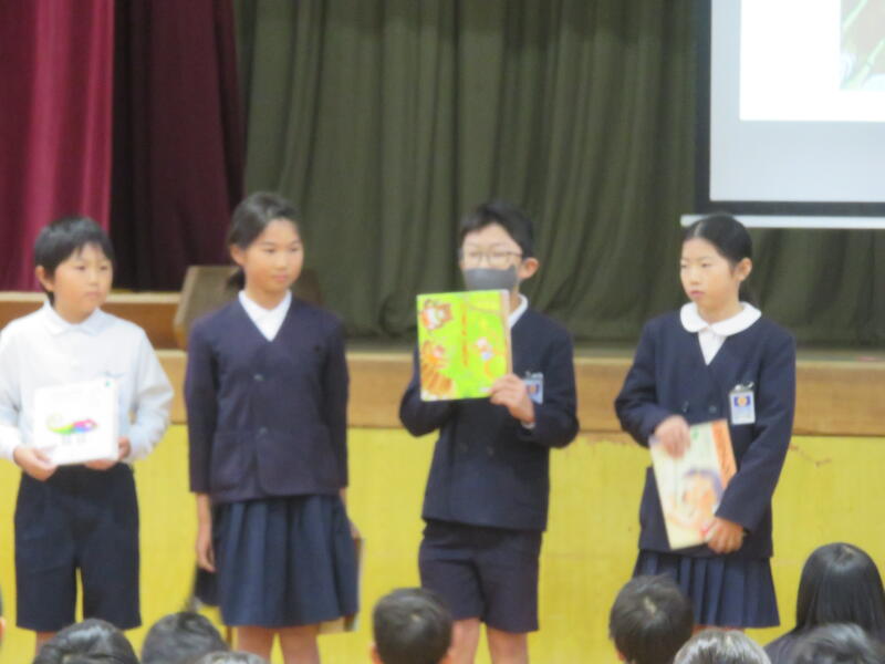 人権標語紹介、誕生日ゲーム、環境の大切さ、給食委員のポスター紹介、本の紹介、感謝の気持ちポスター、トイレ思いやりの木、クロスロード、校長先生の話、みんなで歌おう「お陽さまになって」のプログラムで進みました。ともだち集会後には、各学級で集会を振り返りました。