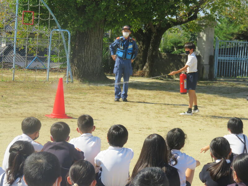 その後、6年生の代表者2名が消火器の使い方を実践しました。