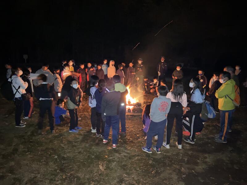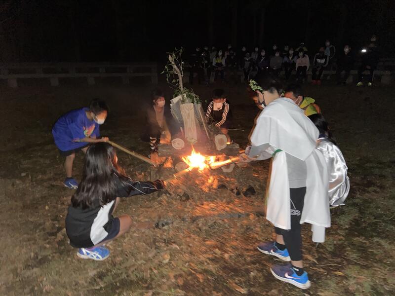 夜はキャンプファイヤー。綺麗な星空の下で班ごとに出し物を行いました。