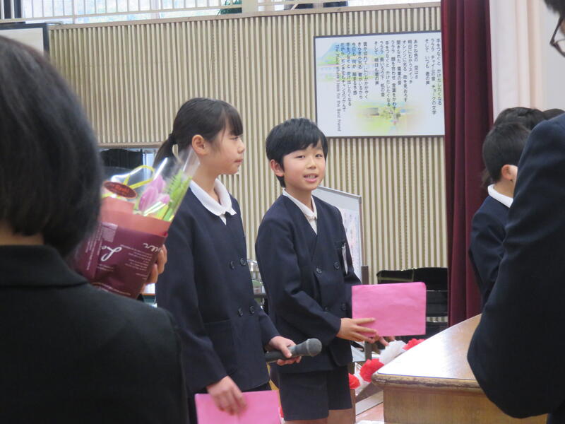 3月28日(金)、退任式を行いました。今年は、4名の先生とのお別れになりました。子供たちは、先生方の話の別れの言葉をしっかりと聞き、別れを惜しんでいました。最後に全校児童で道を作り、退任される先生方を拍手で見送りました。