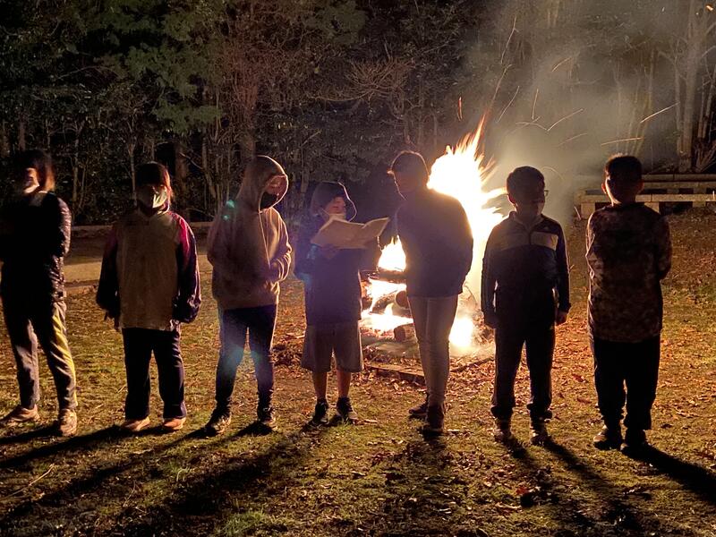 夜はキャンプファイヤー。綺麗な星空の下で班ごとに出し物を行いました。