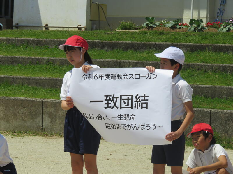 司会進行は、体育委員会が務めました。計画委員会による運動会スローガン発表や応援団員の自己紹介がありました。今年の運動会スローガンは、「一致団結~励まし合い、一生懸命最後までがんばろう~」です。運動会では、仲間を励まし、最後まで一緒にがんばり、友達との絆をさらに深めてほしいと思います。応援団員の自己紹介は、応援団長を筆頭に大きな声ですることができました。