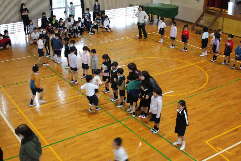 雨天のため、体育館での実施となりましたが、1年生や新しく就任された先生方とのレクリエーションを行い、全校児童で楽しく過ごすことができました。