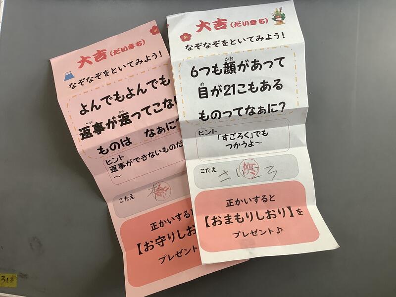 図書室では「図書おみくじ」イベントが行われています。本をかりるとおみくじを引くことができます。おみくじには、「大吉」「中吉」「小吉」となぞなぞが書いてあり、なぞなぞに正解するとしおりなどの景品がもらえるそうです。後期後半もたくさん本を読んでほしいと思います。