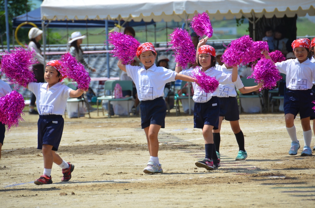 低学年の表現は、「ずんどこパラダイス」。ポンポンとバンダナを身につけ、かわいらしく踊っていました。