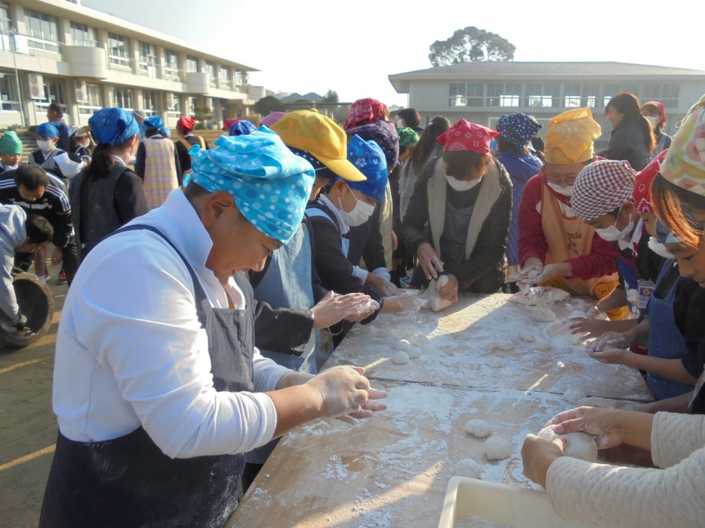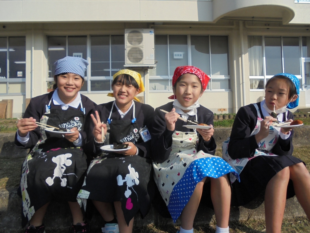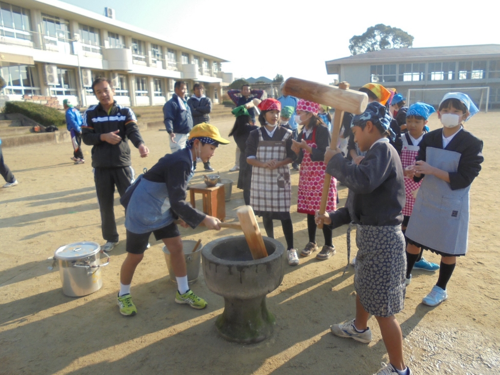 5・6年生が地域の方や保護者方の協力で、田植えと稲刈りを行いました。そして、収穫したもち米を使って、餅つきを行いました。「きね」と「うす」を使った餅つきは、なかなか経験できるものではありません。つきたてのお餅は、本当に美味しかったです。