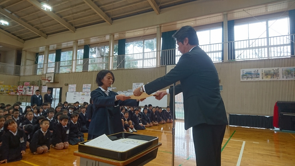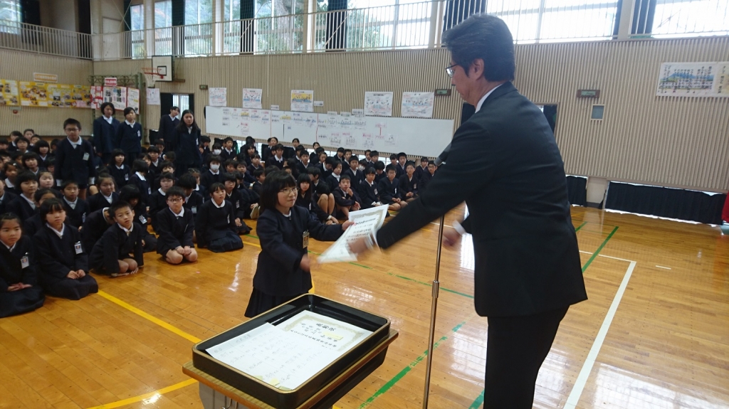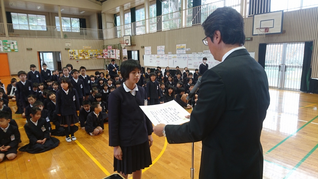 表彰では、作文や書道、絵や標語でたくさんの児童が入選しており、表彰されました。