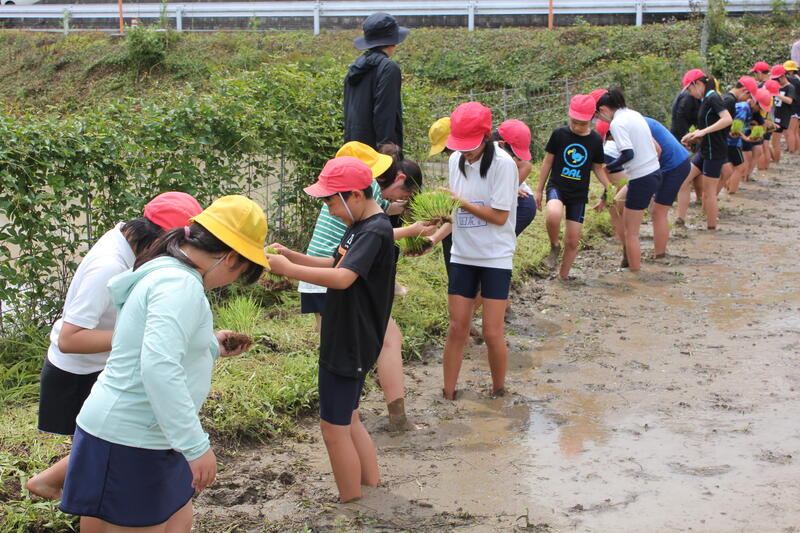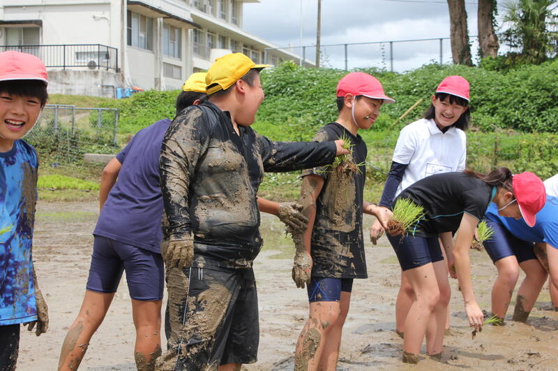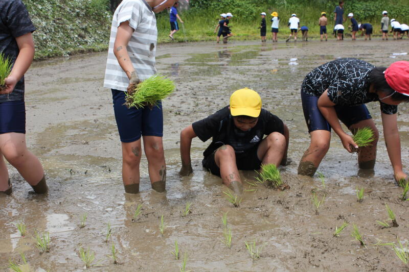 田んぼの中は歩きにくく、尻もちをつくこともありましたが、楽しく田植えができました。これから、餅米になるまでの稲の生長を楽しみに、見守っていきたいと思います。