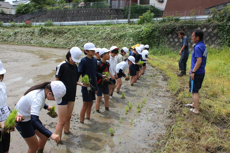 6月26日(月)に5、6年生が学校の田んぼで田植えを行いました。天気を心配していましたが、午後には晴れて田植え日和となりました。