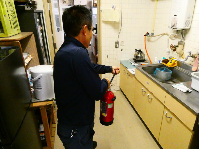 今回は、地震が起こり、更に火災が発生した場合を想定した訓練でした。火元は事務室近くの湯沸かし室としました。