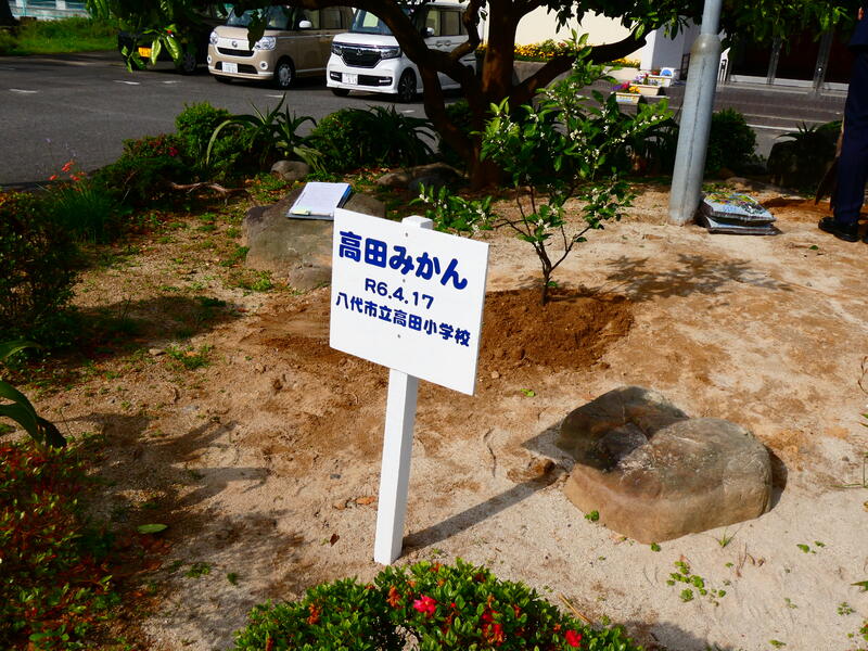 体育館前ロータリー内に高田みかんの植樹をしました。