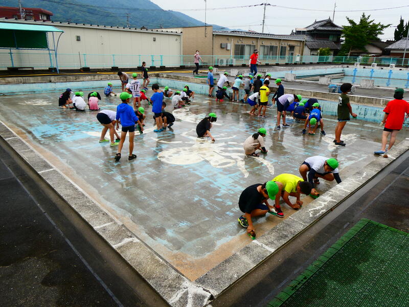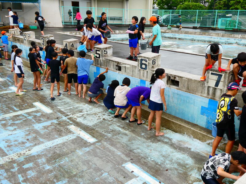 6・5・4年生が、掃除を頑張り、プールをきれいにしました。