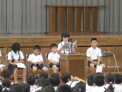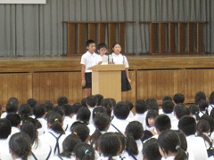 児童集会では、各学年の代表者が水泳学習の感想を発表しました。