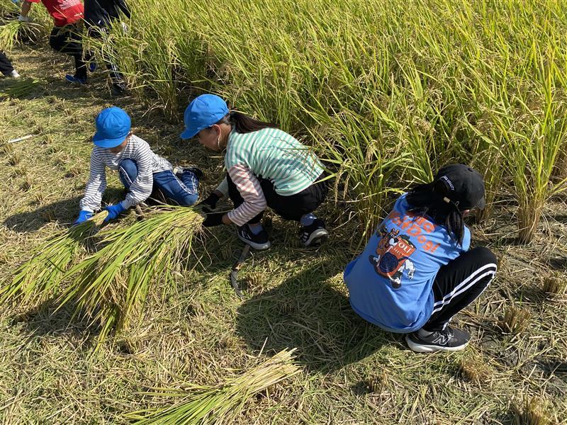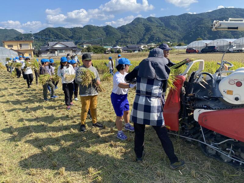 14日(火)に総合的な学習の時間で、お米づくりの学習として稲刈り体験を行いました。児童たちは実際に鎌を使用して稲を刈り、昔の農家さんの働きを体験することができました。