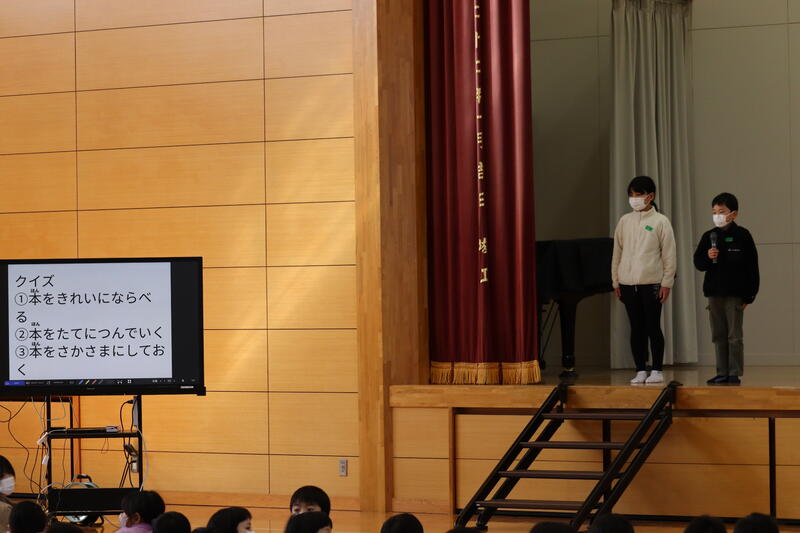 図書委員会は、本の借り方、借りるときの態度等を劇にし、学級ごとの貸出冊数の紹介も行いました。