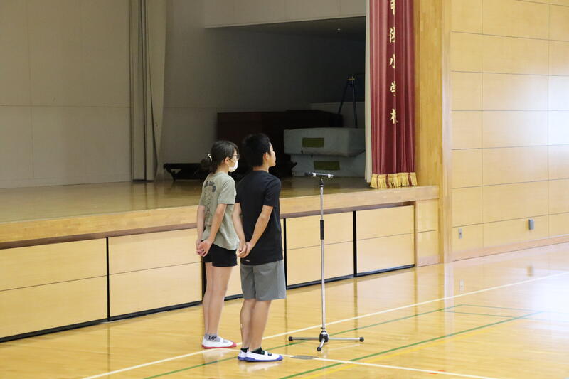 本日の業間、5年生が、明日の郡音楽会に向け、全校児童の前で合唱のリハーサル発表を行いました。