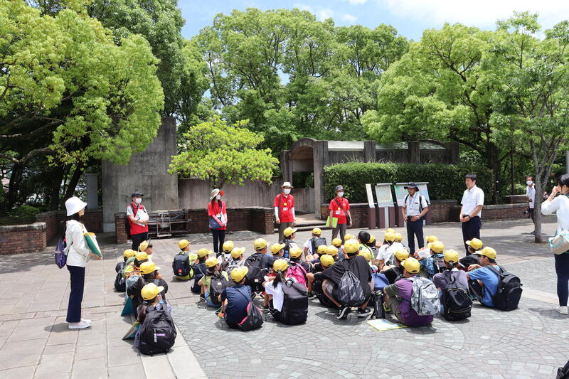 (1枚目)6年生と一緒に、先生の話をしっかり聞く1年生