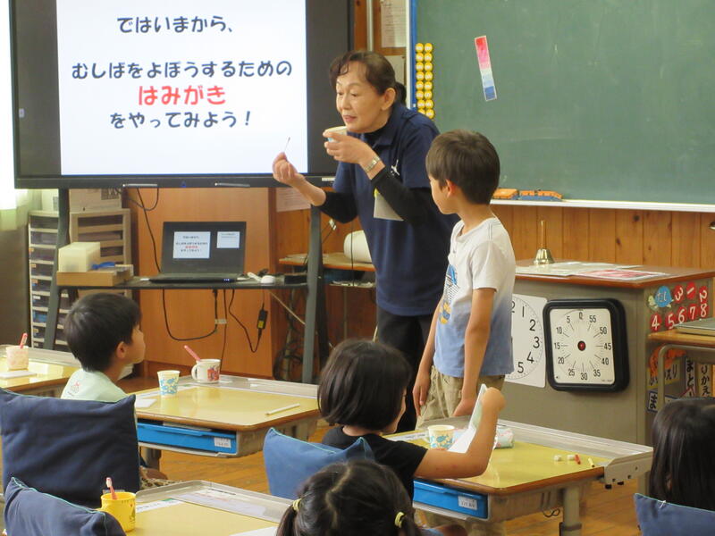 (2枚目)1年生に視力検査のやり方を教える6年生