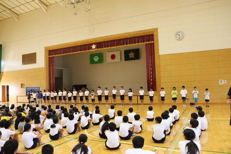 甲佐小学校のスクールモットーは「感謝と貢献」です。誰かのために動き、「ありがとう」の言葉が