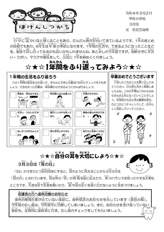 いよいよ最後の月となりました。甲佐小全員で、元気に今年度を締めくくることができればいいなと思います。