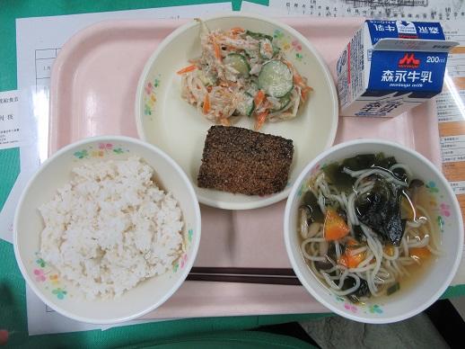 麦ごはん 牛乳 魚そうめん汁 サバのごま衣焼き バンバンジーサラダ