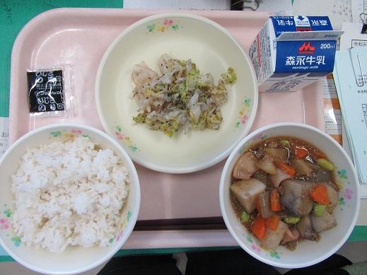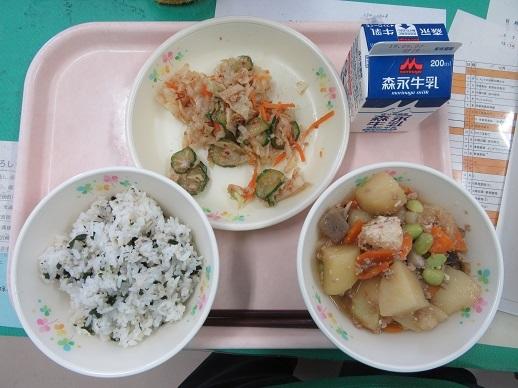 麦ごはん 牛乳 イカと里芋の煮物 野菜のゆかり和え のりの佃煮