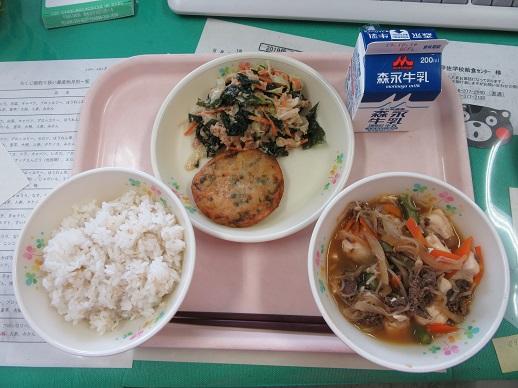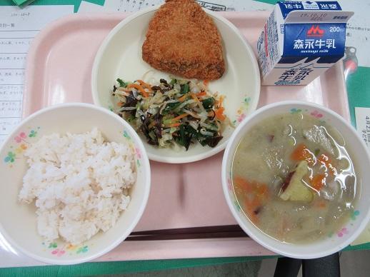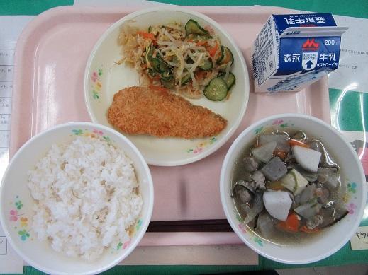 麦ごはん 牛乳 さつま汁 カツオのフライ にらの和え物