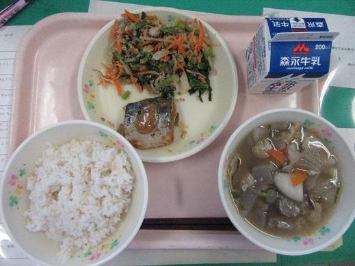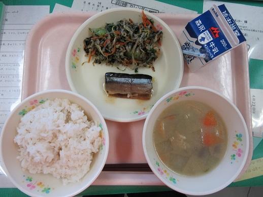 麦ごはん 牛乳 秋の味覚汁 さんまのしょうが煮 野菜の磯和え