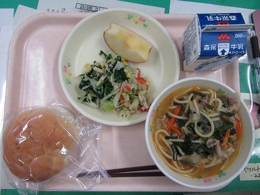 米粉パン 牛乳 豚キムチ麺 ほうれんそうのサラダ りんご