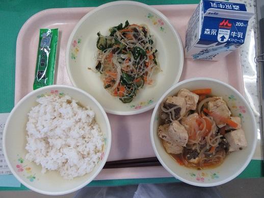 麦ごはん 牛乳 豆腐の煮物 にらと春雨の和え物 のりの佃煮