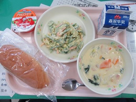 コッペパン 牛乳 クラムチャウダー 枝豆サラダ レモンゼリー