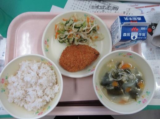 麦ごはん 牛乳 かつおのフライ 玉ねぎのみそ汁 かみかみするめ和え