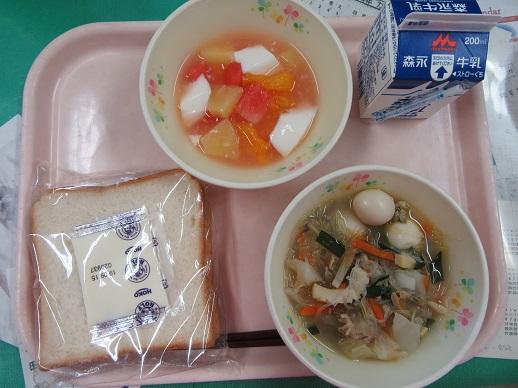 丸パン 牛乳 大豆とひきにくのトマト煮 フルーツヨーグルト