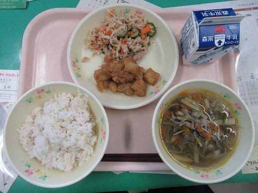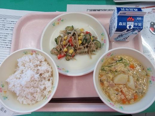 麦ごはん 牛乳 豚じゃが 野菜の甘酢和え 手作り佃煮