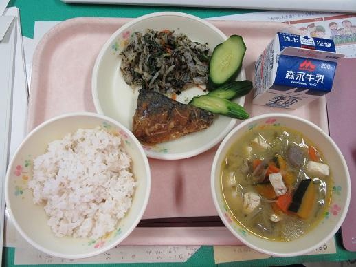 麦ごはん 牛乳 かぼちゃのみそ汁 さばのみそ煮 野菜のゆかり和え
