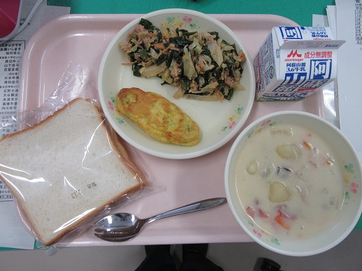 食パン 牛乳 豆乳スープ オムレツ わかめとツナのごまサラダ