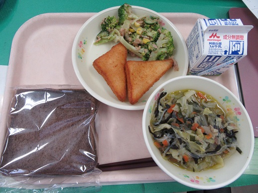 玄米パン 牛乳 にらたまスープ かぼちゃひき肉サンドフライ わかめとツナのゴマサラダ